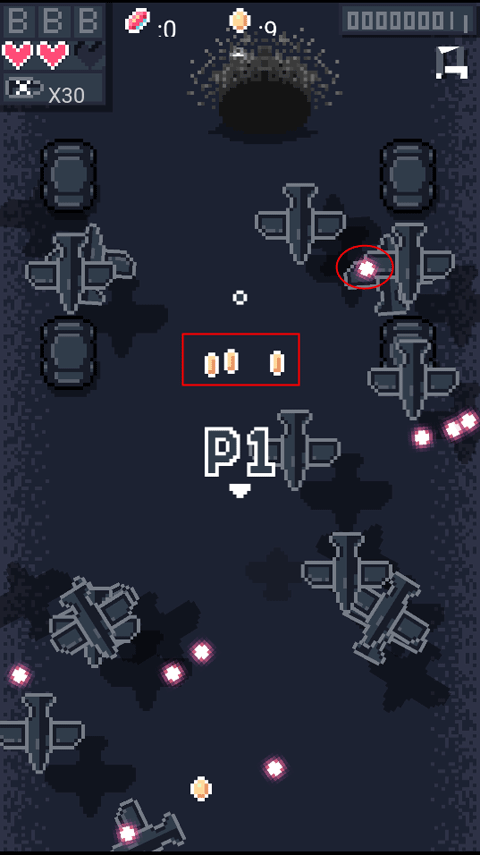 5、玩家的飞机也是有小炮弹的,如果想加大敌机的伤害,可以触碰红色框框选择的道具,这项工具可以让飞机的导弹攻击力变强,导弹数量变得更多。