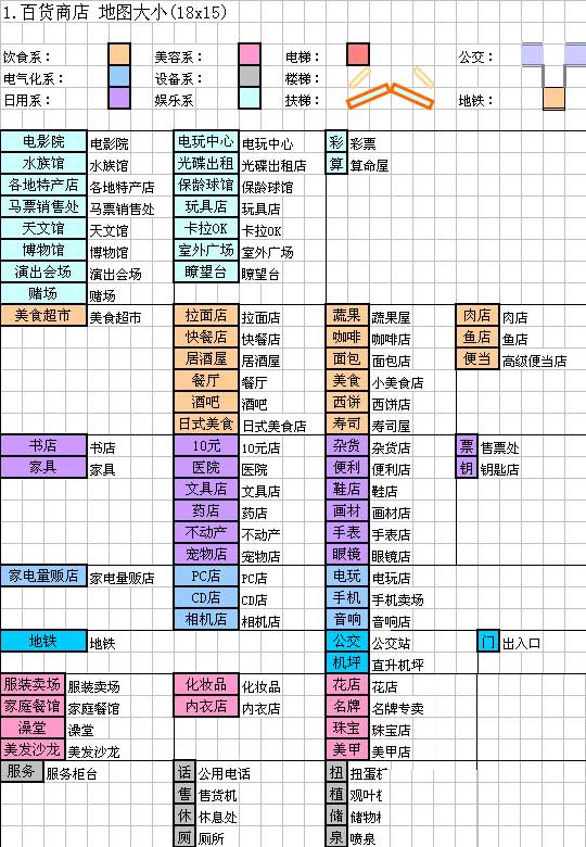 百货商场物语布局图拥有双电梯,由于不可能达成全特色商群(唯一建筑与最大宽度的矛盾)。舍弃了一些不能共存的商群和设备系商群或者重复建设过长商店的商群,共实现23商群。保证双侧电梯直达15楼。