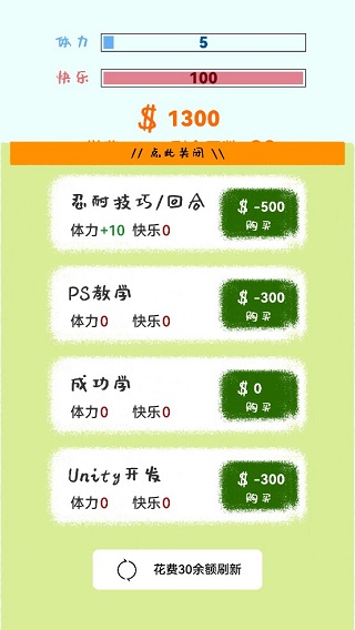生活放过我游戏中共有五项选择,分别是吃饭、购物、工作、娱乐和学习,其中吃饭可以补充体力,购物、娱乐可以提升您的快乐值,反之工作和学习会消耗您的体力与快乐,通过合理的时间安排,保障自己的生活能够持续。具体操作,可通过点击以上五项,来补充当前状态,时间跨度是30天。你能否在这30天里,靠仅有的余额生活,且看玩家们自行选择啦!