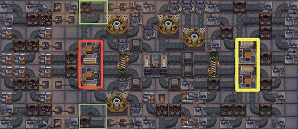 实在需要钢板绝缘线了,就把红框两个长机械臂调到其他方向即可,这样左半侧产出的钢板绝缘线会留存下来,右半侧产出的钢板螺丝则会继续用来生产内燃机。