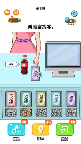 游戏里的特色很明显:操作简单容易上手,画面色彩丰富,老少皆宜,适合和家人朋友一起玩。每次成功算对零钱都很有成就感,特别是看到自己进步的时候,那种满足感特别强。不过有时候遇到特别复杂的找零题,真的会让人有点抓狂,但也正是这种“难”,才让游戏更有意思。