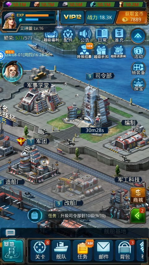 1、科技:大家应该知道前期科技资源要求低,首先科技等级,然后是科技馆等级声望等级,主升铁油铜资源科技,再升航母。资源够的情况下还可升仓库科技,建筑科技、每曰任务和团副本可以获得声望。