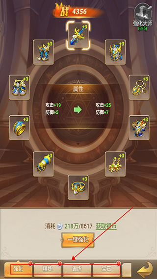 5、通过完成任务,可以获得大量装备,这些装备都可以进行锻造提升,通过强化、精炼、锻炼、镶嵌宝石等大幅提升战力。
