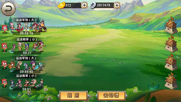 押镖:首先,主公可以选择“运送军饷”还是“运送粮饷”,然后开始选择运送大量或者是少量。(运送量越大,奖励越丰厚,但运送花的时间较长-----因为有被劫镖的危险)