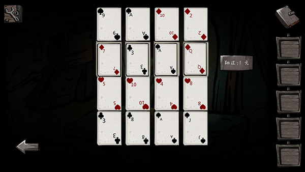 2、点击右边的门卫室,和里面的人玩牌。根据其他固定的牌,可以找到规律,第一列是从上到下依次递减2,所以第一列数字为“7”;第二列由上到下依次递减2,所以第二列数字为“Q”即“12”;第三列是从上到下递减3,所以第三排数字为“7”;第四排是从上到下递增3,所以第四排的数字为“5”。(还要注意花色哦,从左到右依次为方块、方块、梅花、梅花)