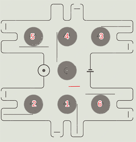 11、如图首先点击(1、2、3、4)四个齿轮,当齿条不动时,点击(5、6)齿轮。