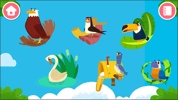 玩起来很简单:下载安装后选择场景开始,左右移动躲避障碍物帮助小鹰飞翔,还能投喂食物给鸟儿。点击书本标志可以查看鸟类信息。最有趣的是帮燕子筑巢,带鸟宝宝捕鱼、找水果,最后还要指引鸽子送信。这些设计既好玩又能培养宝宝的观察能力和思维能力。