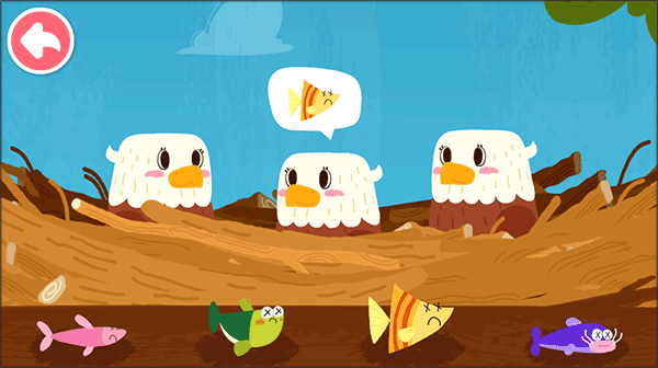 3、快看,鸟宝宝破壳而出啦!宝宝快和小鸟们一起去寻找食物吧!与老鹰、天鹅一起在激流中捕鱼;与鹦鹉、巨嘴鸟共同在丛林中飞行,寻觅新鲜水果,为鸟宝宝们准备一顿美味大餐!哇!小鸟们带回来的食物好多呀,快根据鸟宝宝的要求,挑选食物喂饱它们,这样它们才有力气练习飞行呀!