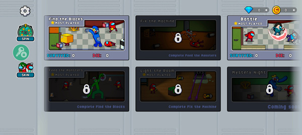 游戏特色包括随机身份和挑战任务,玩家需要隐藏自己、收集道具来完成目标。操作简单,通过转盘抽奖获取金币解锁角色皮肤,选择模式后即可开始游戏。每个夜晚的任务不同,比如寻找积木、喂食怪物等。