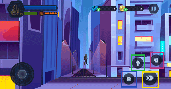 2、绿色方框内的按钮是跳跃,红色方框内的按钮是技能,黄色方框内的按钮是冲刺,蓝色方框内的按钮是背包;