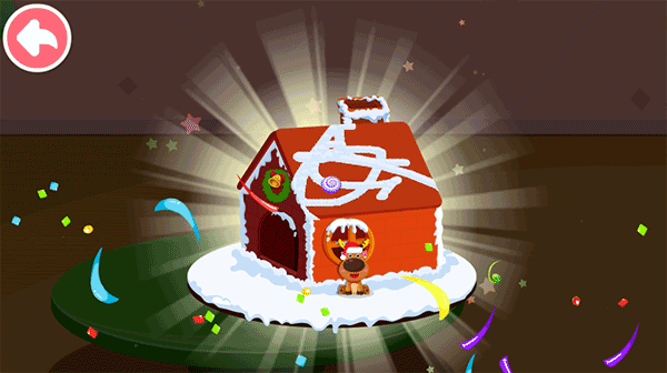 4、点什么?点击糖果盒,把糖球、拐杖糖和小熊软糖放上去吧。哇,好可爱的姜饼屋!