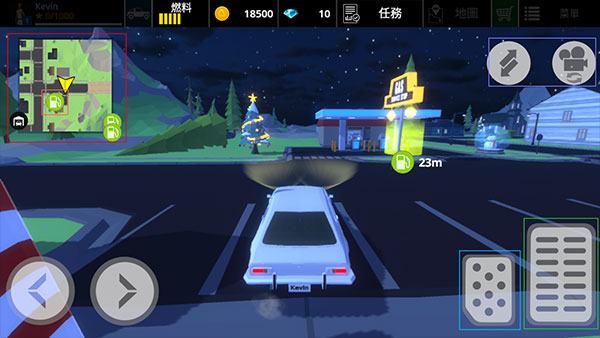 4、根据左上角的地图查看地图的加油站所在的位置,左侧的箭头可以控制汽车方向,右上方的双向箭头可以挪车,摄像头可以切换开车视角,右侧分别是刹车和油门。