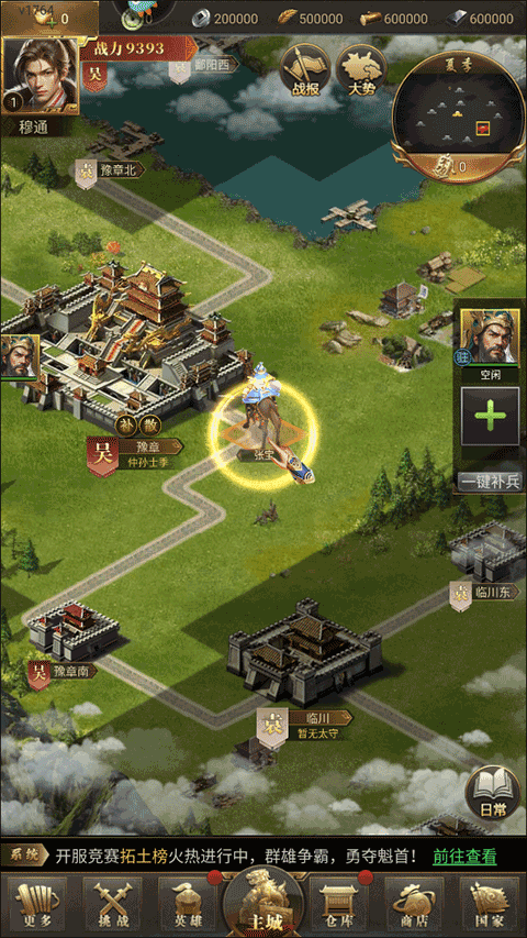 4、城池治理:每当新占领一个城池时,城池上会出现治理任务,完成可以获得大量资源和元宝奖励,并解锁城池的建设