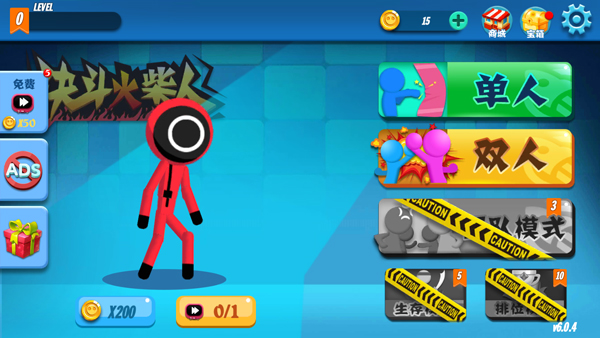1、打开火柴人冲突双人格斗,游戏现有单人、双人、组队模式、生存模式、排位模式五种;