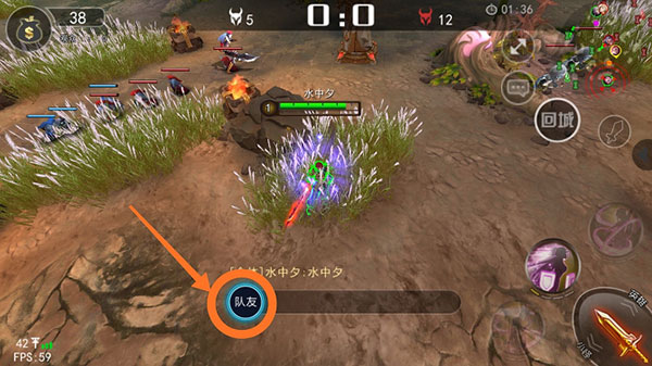 ② 进入草丛后,会出现“回城“二字,如图,点击后,几秒钟后便可到己方泉水。