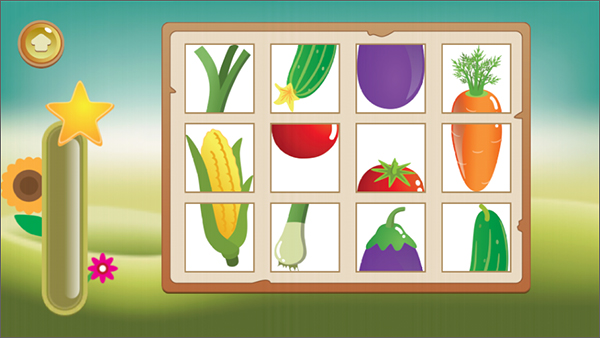 3、以蔬菜拼图玩法模式为例,小朋友需要点击蔬菜碎片将蔬菜合成一个;