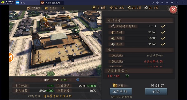 除了「大殿」和4种资源类建筑外,「兵营」则是《新三国汉室复兴》中最核心的建筑之一。透过升级「兵营」,玩家不仅可以扩大兵营容量,而且还可以提升单次招募的上限以并强化士兵的攻击能力。透过强化你的当前兵力,玩家将可以挑战等级更高的野怪,并且可以抵抗更强的敌人之攻击。