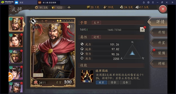 在武将个人资料介面中,玩家可以查看到武将资讯,并且可以使用各种特殊功能进行武将强化