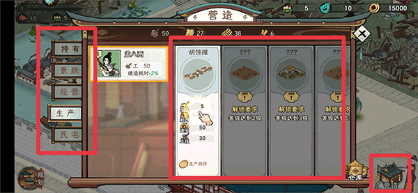3、区域修复完成后,玩家可以在空地上建造,点击右下角营造,然后再营造中选择你要放置景致、经营、生产、民宅
