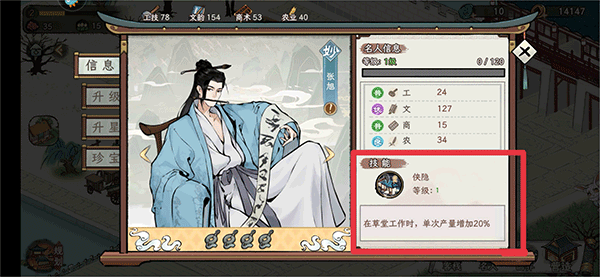 7、游戏中除了玩家角色外,还可以招募各种名人,名人带有不同的技能,例如张旭,若玩家将他安排至草堂工作,则单次产量可以增加20%。