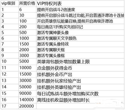 -游戏初期金币、英雄经验、进阶徽章会缺一些,但是开区10天后基本上就不会缺经验和徽章了。整个游戏期间,金币用处很大,用途也多,所以别以为自己金币很多乱花。附上VIP金额图,供大家参考。VIP特权在游戏内头像下方可直接查看。