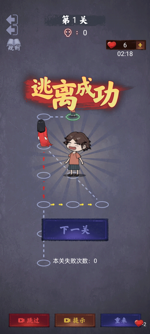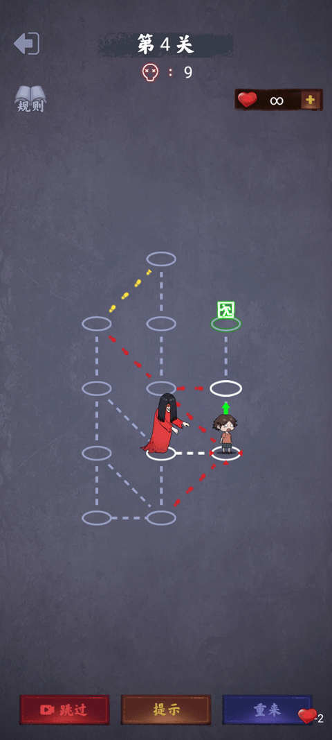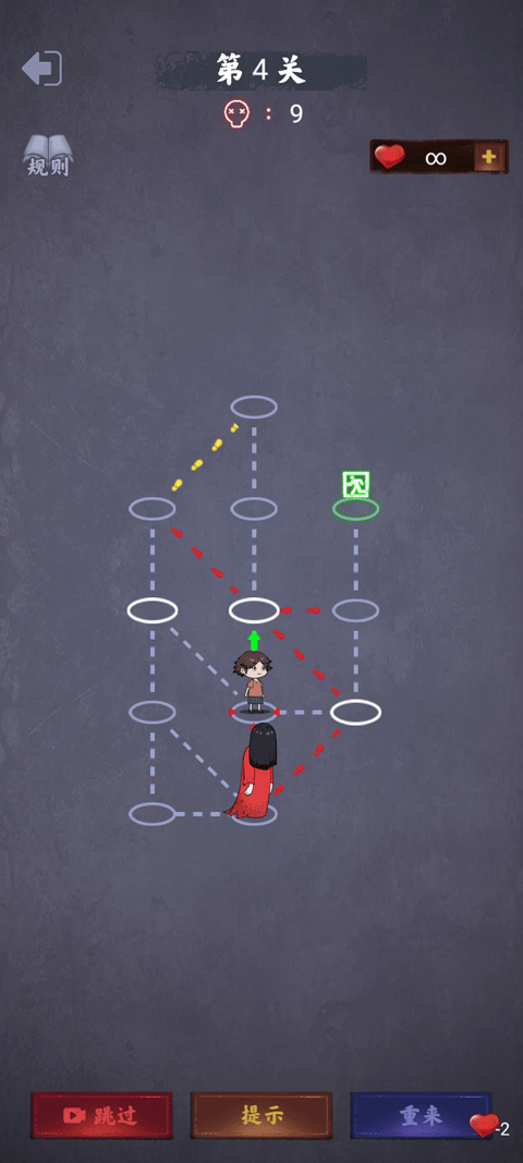 第四关有点复杂,需要玩家将鬼从第一列和第二列圆圈绕一圈,最后返回第一列的倒数第二个圆圈,就能到达终点了。