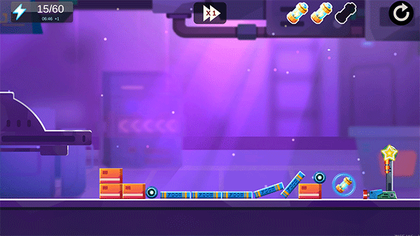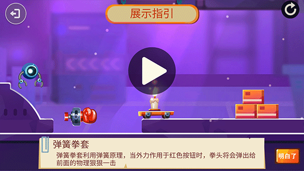 2、第二关开始点击最左边的小球机器人,当他变成小球后滚动到达放大镜的旁边后,通过放大镜光的折射可触发物理反应,当小球触发到开关让最右侧的旗帜升起来,就可以胜利通关了。