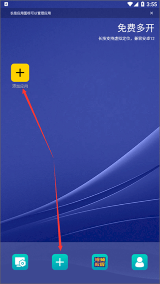 1、打开虚拟双开王app,进入软件后点击“添加应用”或下方的“+”按钮即可添加软件实现多开;