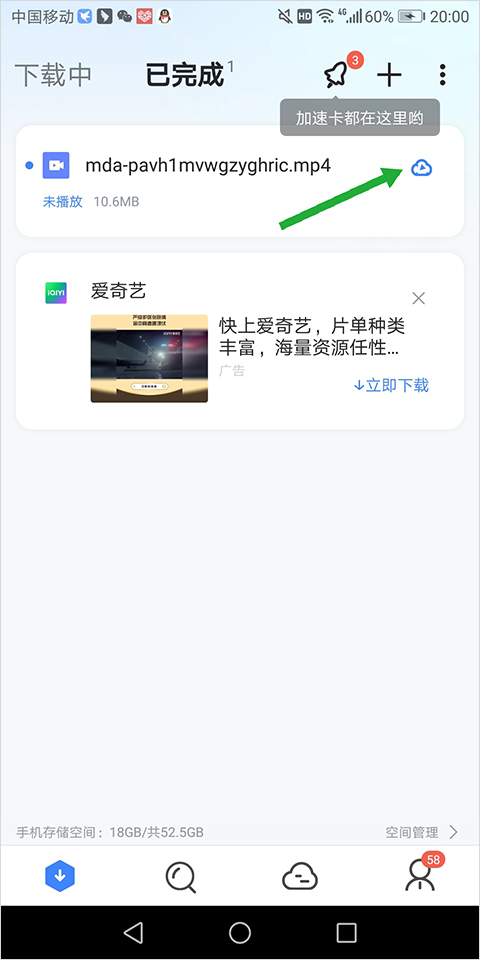 4、如果用下载记录消失,可以前往首页的【已完成】页面中,点击文件右侧的【云同步】按钮(下图绿色箭头所指)