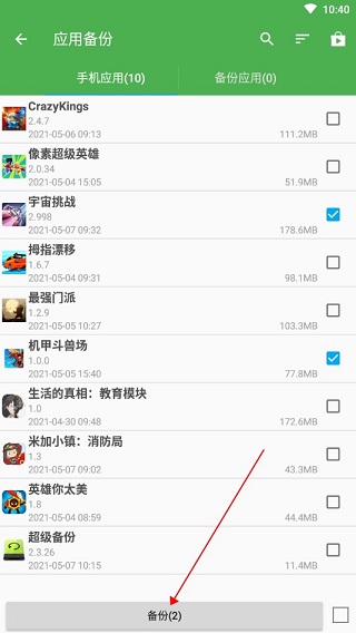 2、从应用备份的页面里点击勾选想要备份的软件,通过底端的“备份”按钮就能够进行备份保存了。