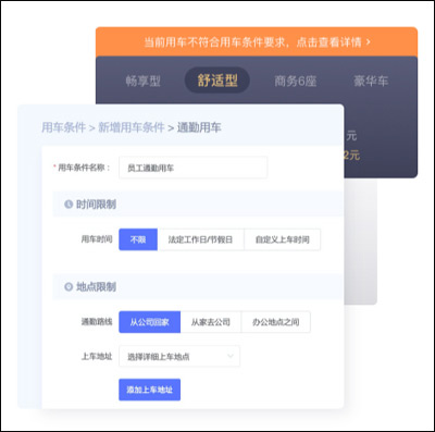 目前支持的出行场景有【通勤用车】【审批用车】【一口价】【商务出行】【员工垫付】等,每个出行场景下有企业管理员为您配置的用车条件。选择一个用车条件,在符合该条件的要求下进行用车。