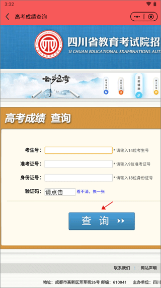 2、在输入框中填写考生号、准考证号和身份证号信息,最后点击“查询”按钮,等待一会儿就可以查看到高考成绩了。