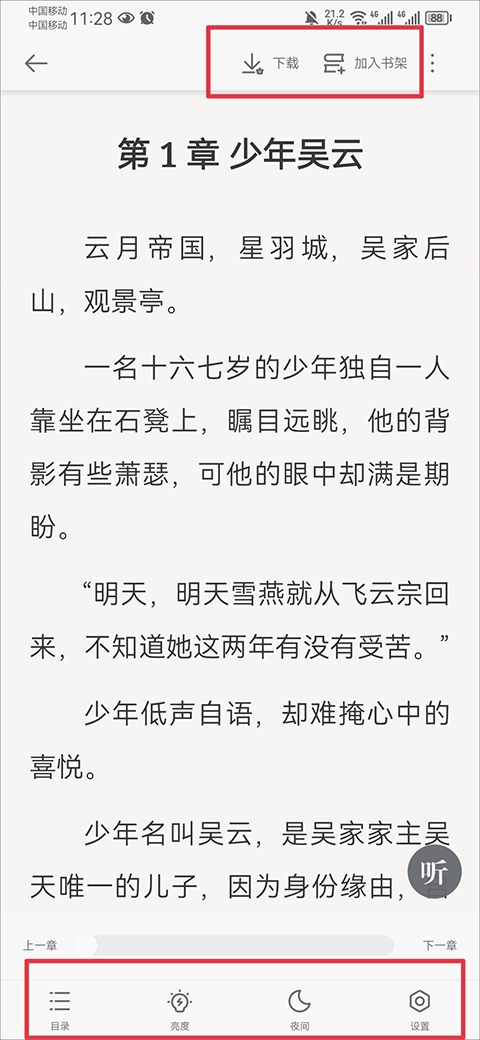 2、选择小说后点开即开阅读,点击屏幕后还可以呼出菜单,用户可以将它下载、加入书架,也可以查看目录、调整亮度、更多设置等