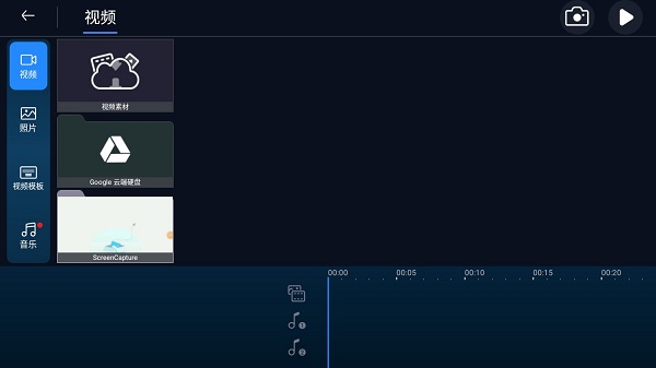 4、选择好之后,进入剪辑界面,在这里你可以选择视频素材,照片或是视频模板和音乐。