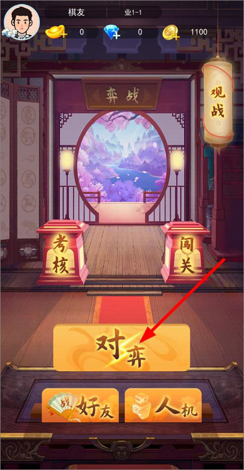 2、象棋玩法页面有考核、闯关、对弈、战好友、人机等,点击对弈;