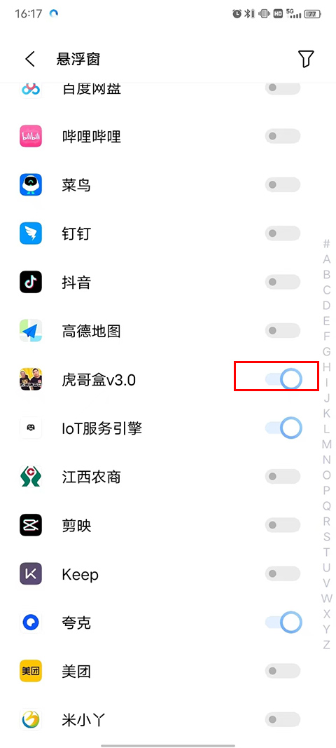 2、接着会自动跳转到你手机上的悬浮窗设置,找到虎哥盒v3.0,点击右边按钮开启悬浮窗。