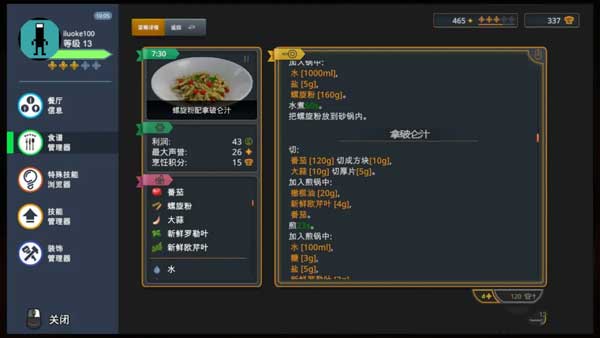 另外随着你的星级升高,每天结束后的结算会强制你选择学习一门高难度食谱,难道什么程度呢?对烹饪手法的要求更加复杂,对烹饪时间要求更加苛刻,像这道【螺旋粉配拿破仑汁】,且不说要求将一个番茄切成等分的12块,居然要煎23S,再倒入100ml调配过的水,要知道,计时器只能计时10S的倍数,这道菜稍微有一点点迟疑,就会出现配菜过熟,大蒜太生的情况,这道菜直到截稿我最高只拿到4星。