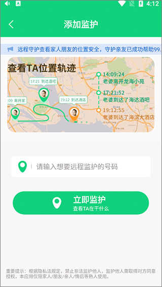 郑重声明:不允许非法使用本软件,此软件只能用于亲友之间安全守护,不允许用于其他侵犯隐私用途,一经发现,将冻结相关账号,并追究其法律责任。