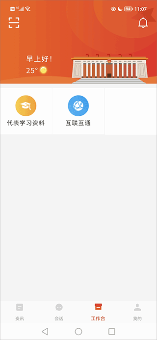 1、打开河南人大app,在软件的工作台页面找到并点击“互联互通”按键;