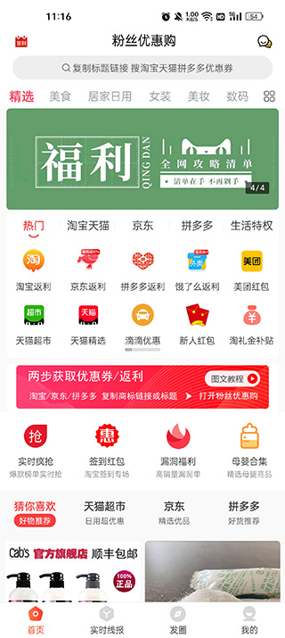 作为一个购物“剁手党”,看到喜欢的商品就想购买,所以小编为你带来了粉丝优惠福利购app,这是一款能帮助用户省钱返利平台,里面拥有大量优惠券,先领券再购物,比平时省下更多的钱。软件每日都会更新百万购物优惠券、淘宝天猫优惠券,与各家知名电商平台合作,汇集淘宝、天猫、京东、拼多多、抖音等平台大额无门槛优惠券。值得一提的是,粉丝优惠购app不仅仅能省钱还能赚钱,将软件内推荐的商品分享到手机朋友圈,还能获得平台给出的特殊奖励,对于新人,还特别准备了各种无门槛红包福利。相信有很多小伙伴已经心动了,心动不如心动,感兴趣的用户可以来本站下载使用。