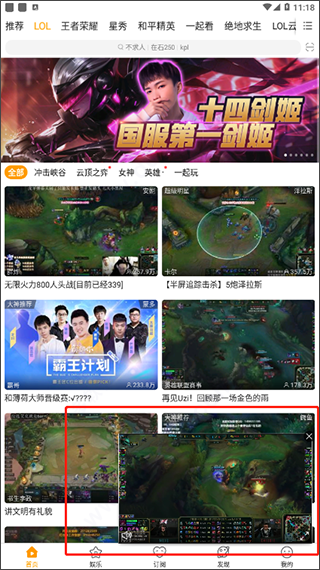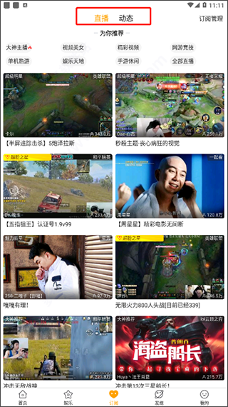 1、下载安装好虎牙直播后即可运行使用,可以看到软件主要划分成为首页、娱乐、订阅、发现、我的五大部分,在首页可看到海量不同游戏类型的直播内容;