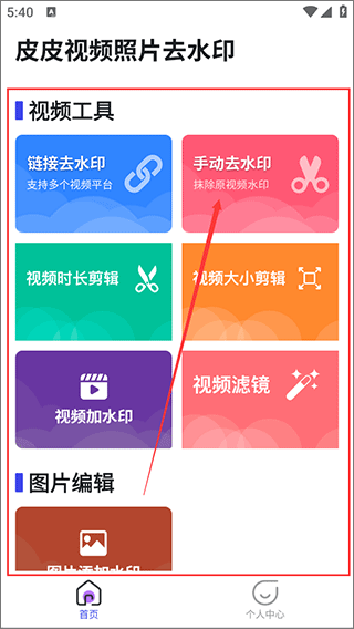 1、进入软件后我们可以看到链接去水印、手动去水印、视频时长大小剪辑、视频加水印等各种实用功能,根据自身需求进行选择;