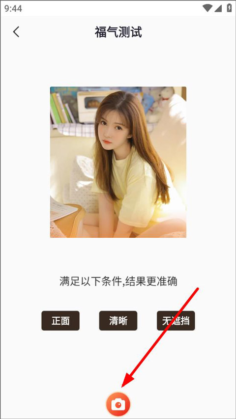 2、福气测试需要满足正面、清晰、无遮挡的照片条件,点击相机;