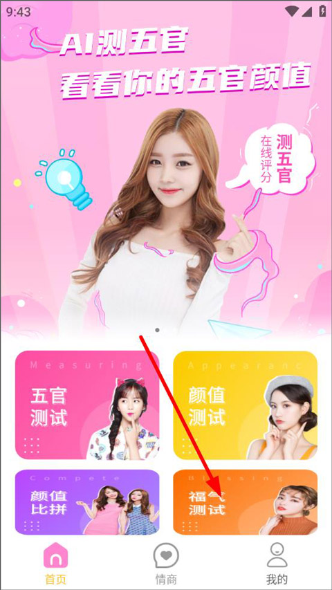 1、打开测测脸型app,登录进入首页,首页有五官测试、福气测试、颜值测试、颜值比拼等功能栏,点击福气测试;