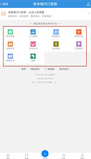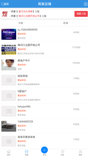 1、在本站下载安装梅河口信息网app,可以看到有首页、商家、发布、历史、我的五个板块;