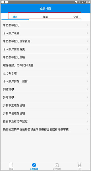 2、右划进入业务指南,分缴存、提取、贷款等三个部分;