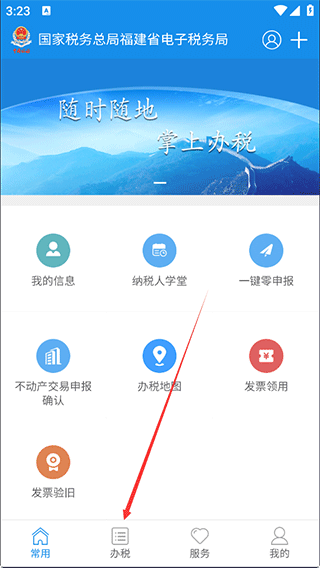 1、打开福建税务电子税务局app,在下方菜单栏中点击【办税】进入;