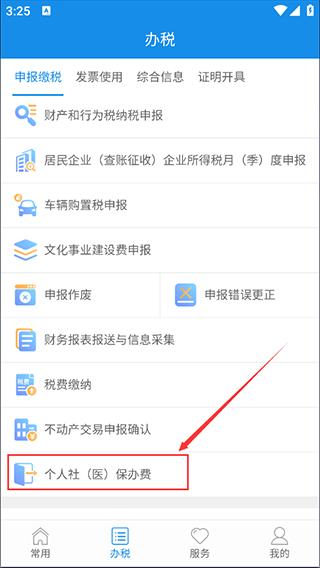 2、在【办税】页面下滑找到【个人社(医)保办费】;