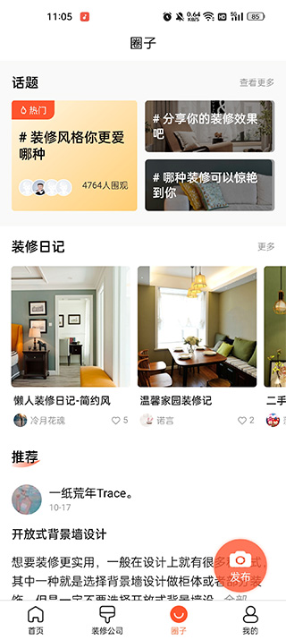 5、点击圈子,用户可以在这里发布各种装修问题和装修风格。