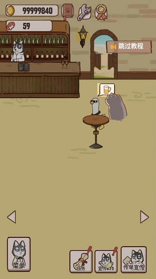 刚开始营业酒吧内空荡荡的啥也没有,先买张桌子好让顾客能够有地座,在主界面中,点击菜单,如图: